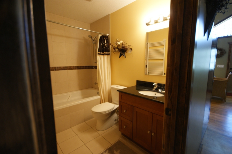 3-piece bathroom with jacuzzi bath tub and heated back rest.